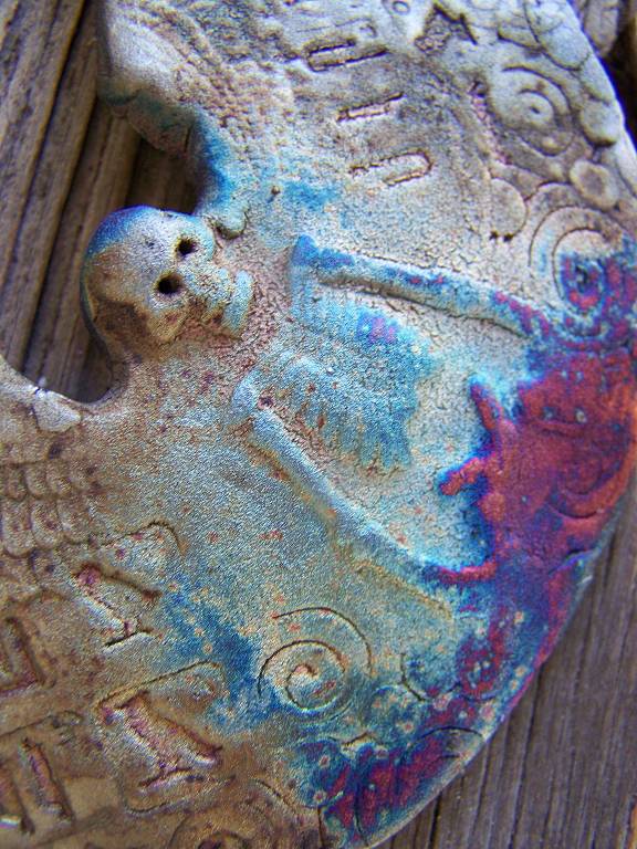 I really enjoy creating these raku and stoneware collars. This one is Halloween/Egyptian themed. Talk about a pastel Halloween!!